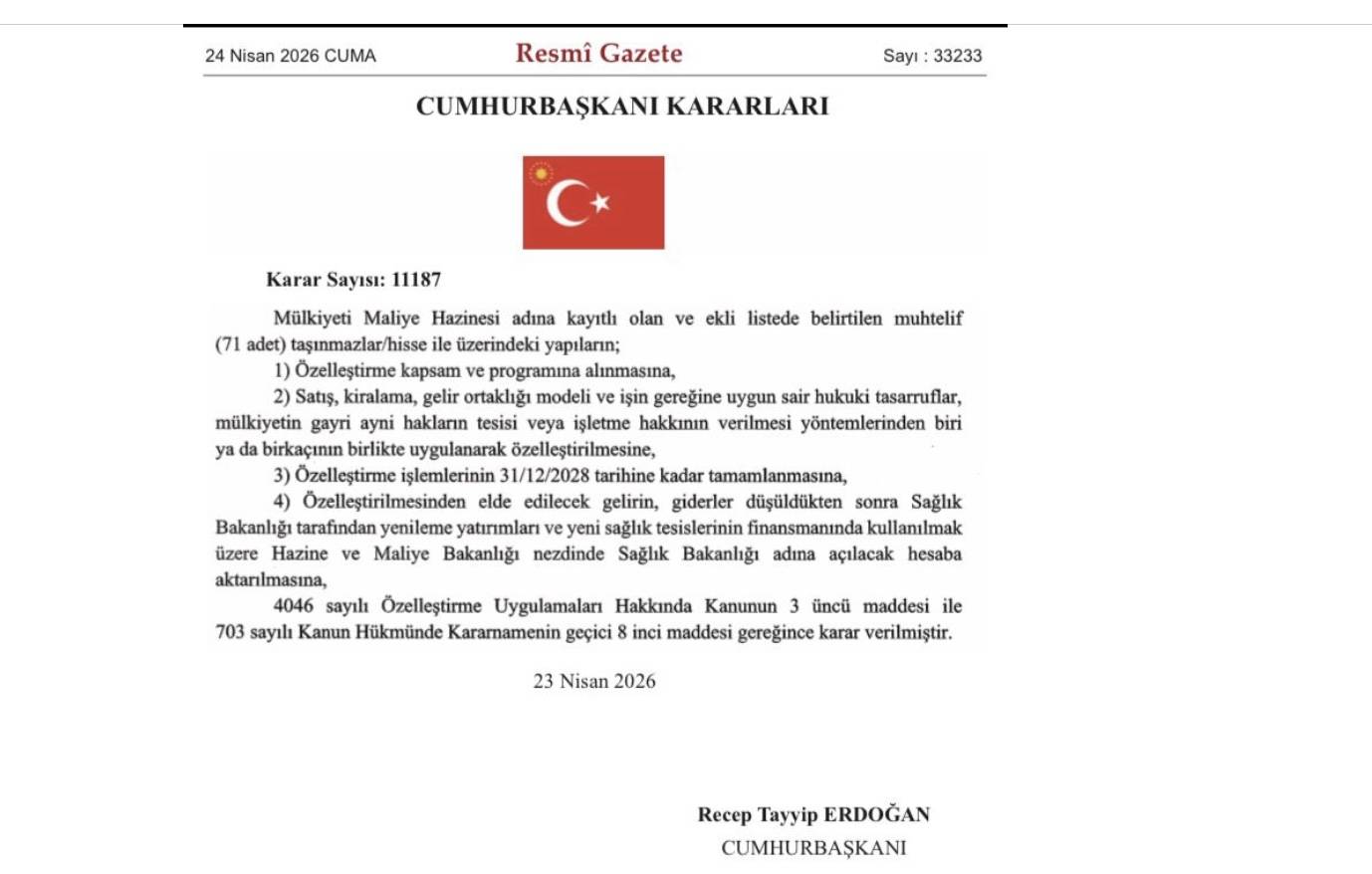 Birlik Sağlık Sen Genel Başkanı Ahmet Doğruyol konu hakkında şu açıklamayı yaptı, “Daha öncede yayınlanmış olan, bazı sağlık kuruluşlarının arazilerinin de yer aldığı kamu arazilerinin satışının ardından bu kez, 24 Nisan 2026 tarih ve 33233 sayılı resmi gazetede yayınlanan, 11187 sayıl karara göre 71 Devlet Hastanesi ve sağlık kuruluşunun arazileri satışa çıkarılmıştır. Karara göre pek çok ilimizde bulunan Maliye Hazinesi adına kayıtlı olan 71 adet taşınmaz ile üzerindeki yapılar özelleştirme kapsamına alınmıştır. Genel olarak il, ilçe merkezlerinde bulunan hastane ve sağlık kuruluşlarının arazileri bulundukları yer ve konuma göre oldukça değerlidir. Yıllardır ifade ettiğimiz gibi, genel itibarıyla yeni yapılan hastanelerin şehir dışına çıkartılarak, şehir merkezlerinde bulunan vatandaşlarımızın kolay ulaşabildiği sağlık kuruluşlarının satılarak gelir elde etme çabası doğru bir yöntem değildir”